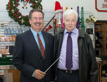 Chuck Surack (left) received a baton from Chuck Mynett symbolizing the transfer of ownership of Mynett Music Company.