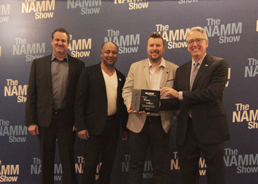 From left, Cosmo Music's Rudi Brouwers, Jerry Hunt and Mark Hebert accept the Milestone Award from NAMM President and CEO, Joe Lamond.